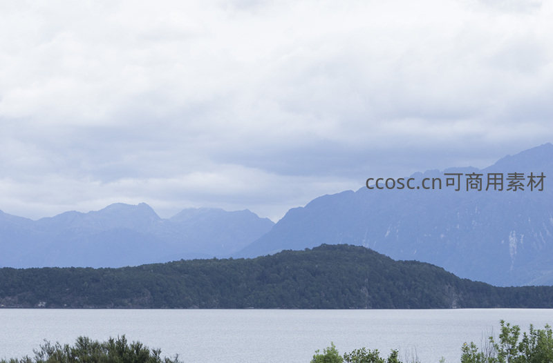 辽阔湖面与青翠山峦交相辉映,天空云层低垂,远山轮廓柔和,整体画面静谧悠远,充满诗意般的自然美感。