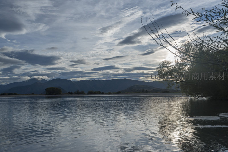 平静的湖面如镜,清晰倒映着远处连绵的山脉与变幻的云朵,前景的枝叶在微风中轻拂,阳光从云层后透出,为整个画面增添了温暖而静谧的氛围。