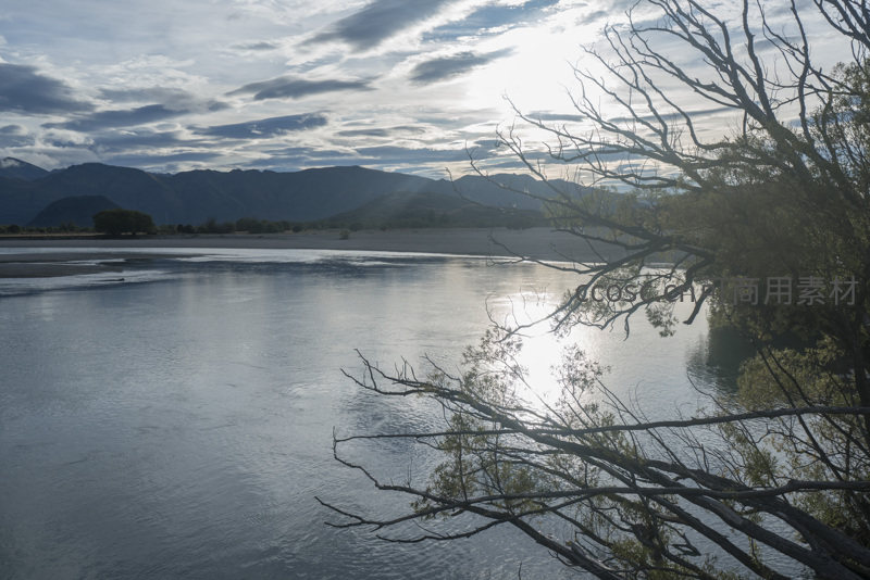 光秃的树枝斜伸入画面,背景是层叠的远山和流动的云彩,阳光洒在河面形成耀眼的光斑,河水波光粼粼,整体构图富有层次感,充满诗意的自然之美。