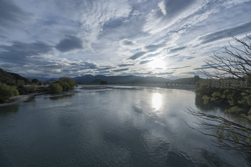 清晨的阳光冲破厚重云层,洒向宽阔的河面,形成明亮的光带,前景的枯枝形成天然画框,远处山峦轮廓分明,整个画面充满宁静、祥和与诗意。