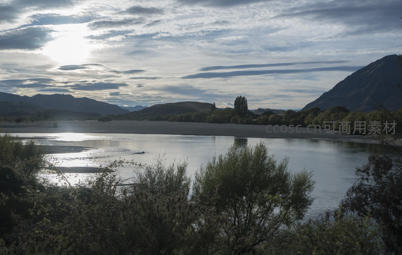 清晨的河谷被薄雾笼罩,阳光穿透云层洒在平静的水面上,远处山峦连绵,近处绿树成荫,营造出一片宁静祥和的自然景象。