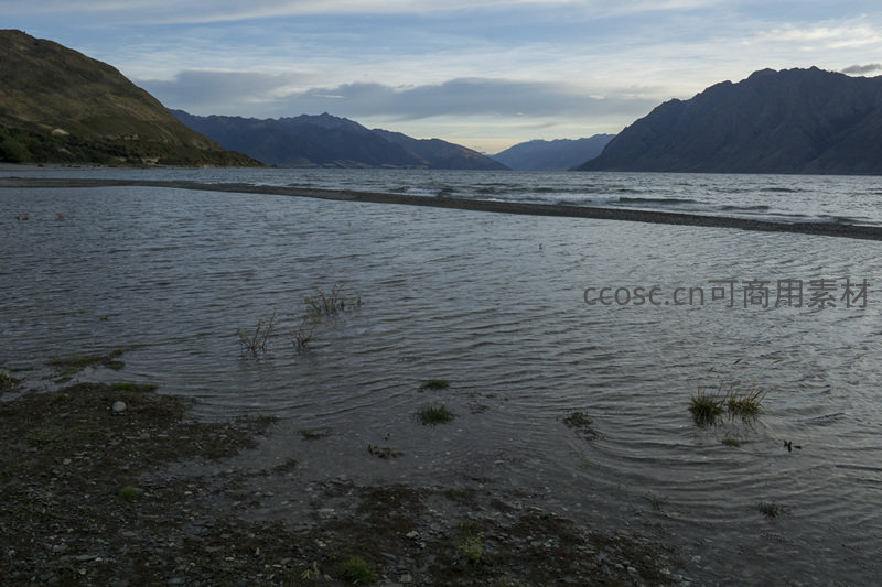 清澈的浅水滩涂中,几丛水草随波轻摇,远处山峦倒映水中,水面泛起细密波纹,展现了一幅静谧而富有生命力的自然画卷。