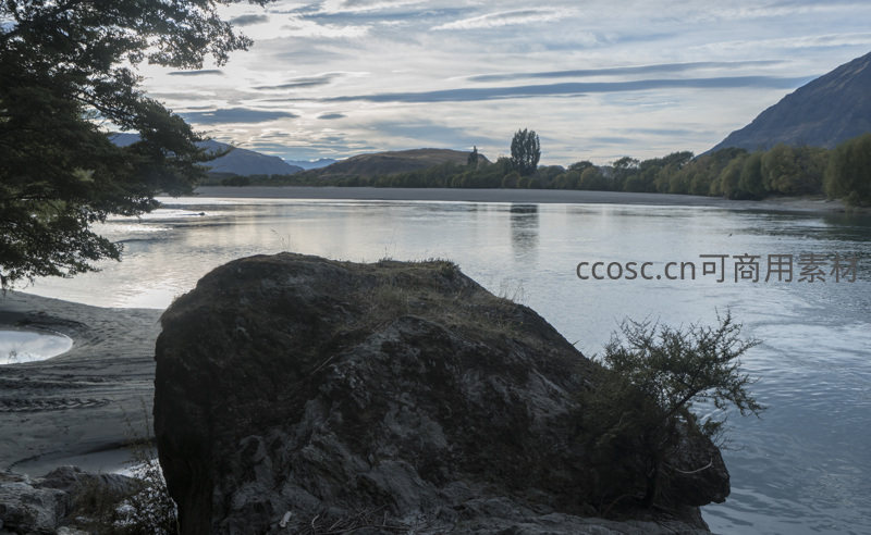一块巨大的岩石静卧于河岸,其上生长着稀疏的植被,河水静静流淌,倒映着天空与远山,光影交错间尽显大自然的原始与静美。