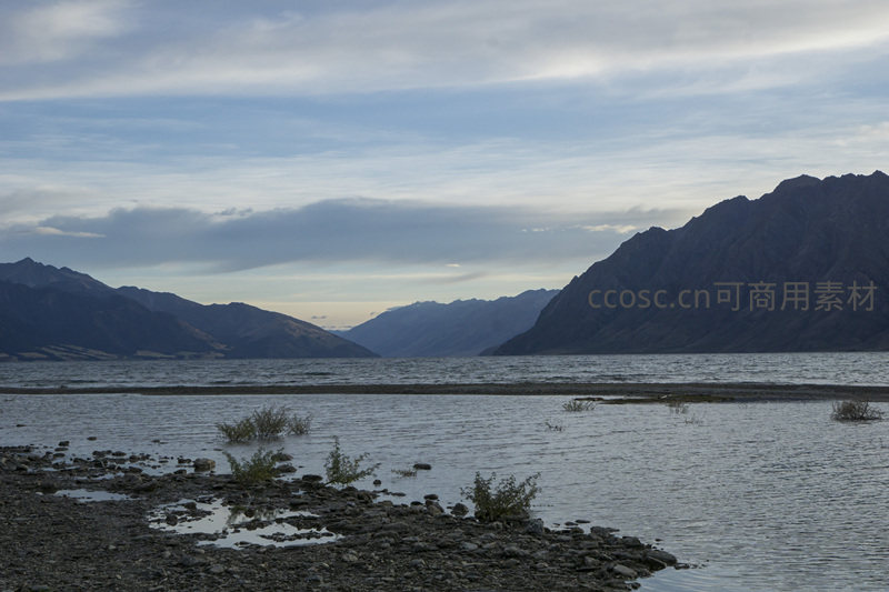 广阔的湖面倒映着远处连绵的山脉与天空中的流云,近处水滩与碎石点缀,营造出一片宁静致远的自然画卷。