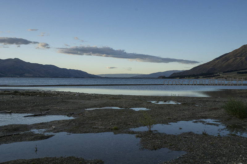 夕阳西下,湖边滩涂上的水洼反射着柔和光线,远山轮廓在暮色中若隐若现,构成一幅宁静而诗意的黄昏风景。