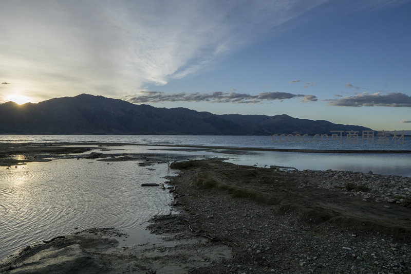 太阳缓缓沉入山后,金色余晖洒满湖面与滩涂,山峦剪影与天空渐变色彩交织,呈现壮阔而温柔的自然时刻。