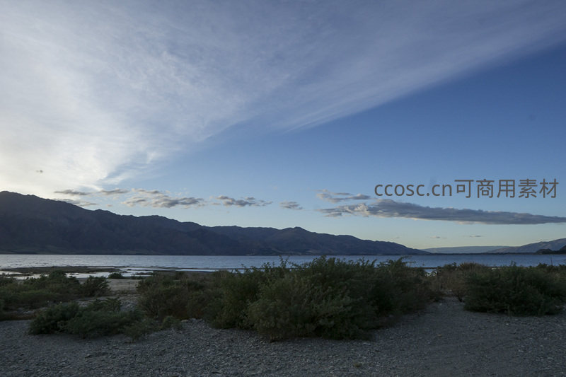 晴朗天空下,湖边低矮灌木错落有致,远处山峦横亘,水面平静如镜,整体画面清新自然,充满野趣与宁静。