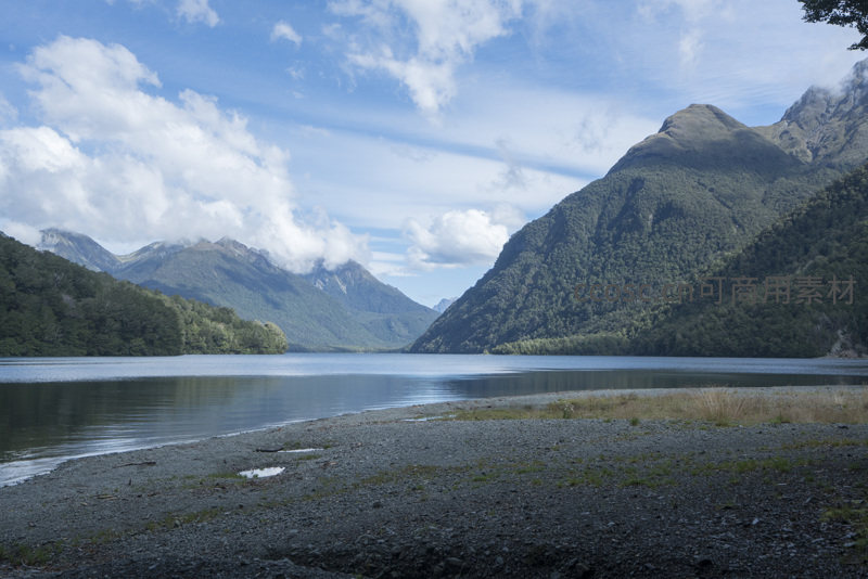 碧蓝湖水环抱葱郁山林,白云飘浮于峰顶之上,岸边碎石滩延伸至水边,展现一幅生机盎然、令人心旷神怡的山水画卷。