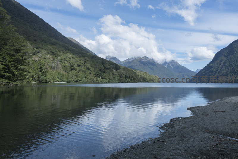 清澈的湖水如镜,倒映着蓝天白云与苍翠群山,岸边碎石与绿树相映成趣,营造出一片远离尘嚣的静谧天地。