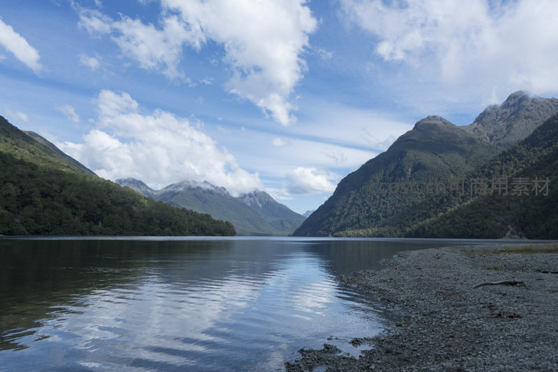 辽阔的湖面平静无波,将远处连绵的青山和飘逸的云朵完整收纳其中,构成一幅壮丽而和谐的自然画卷。