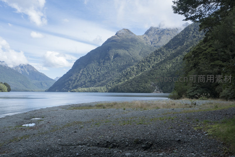 前景是布满碎石与稀疏草丛的湖岸,中景是碧波荡漾的湖面,背景则是覆盖着茂密植被的巍峨山峰,层次分明。
