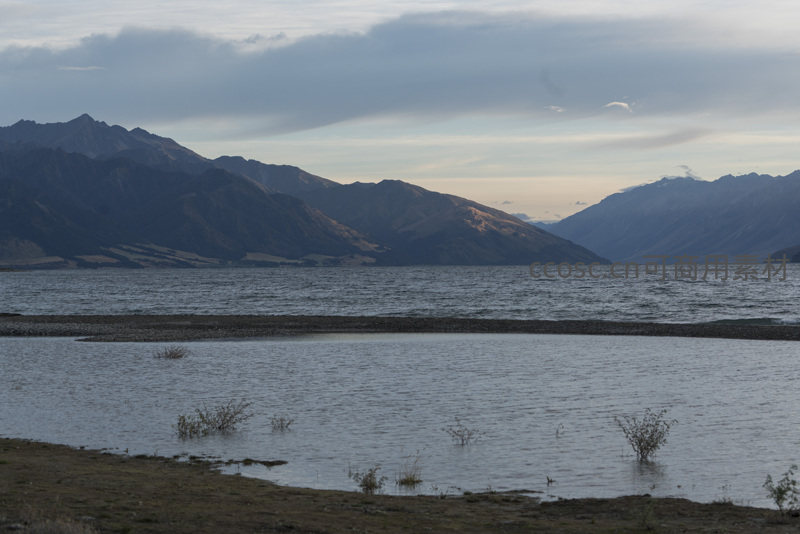 傍晚时分,远山如黛,湖面波光粼粼,浅滩与水草点缀其间,天空云层流动,营造出宁静致远的自然意境。