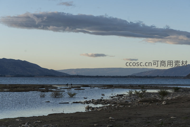 大片云层低垂于天际,覆盖辽阔湖面,远处山脉轮廓柔和,近处滩涂散落石块与植被,呈现黄昏时分的苍茫之美。