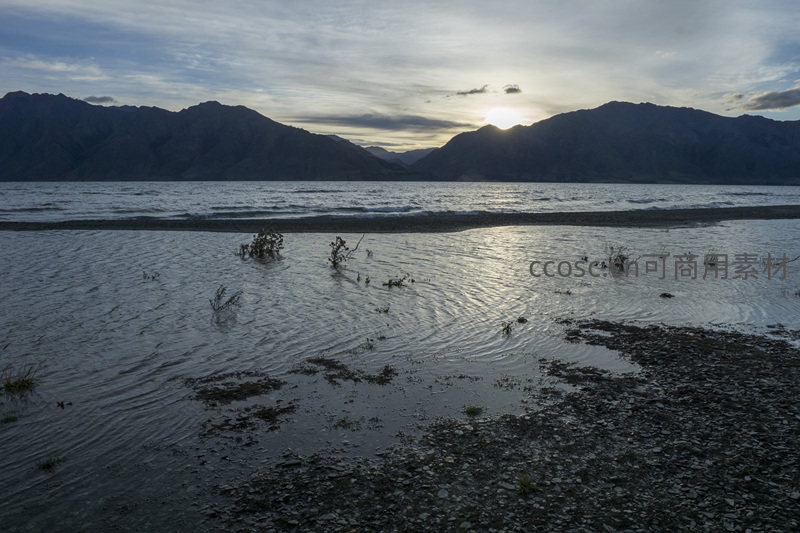 夕阳缓缓沉入远山,金色光芒洒满平静的湖面,水波轻柔荡漾,山峦剪影巍峨壮丽,营造出一片安宁祥和的自然画卷。