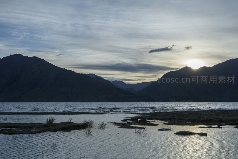 天空云层密布,夕阳从山峰间透出柔和光线,湖水如镜倒映天光云影,远处群山连绵起伏,构成一幅宁静而富有诗意的山水图景。