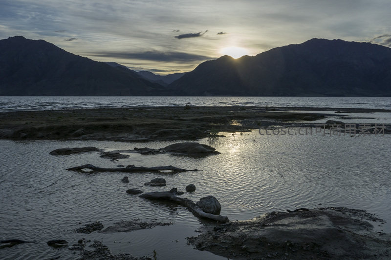 浅滩上散落着枯木与石块,夕阳余晖在水面投下斑驳光影,层层涟漪荡开,远处山峦轮廓清晰,整个画面充满原始自然的静谧之美。