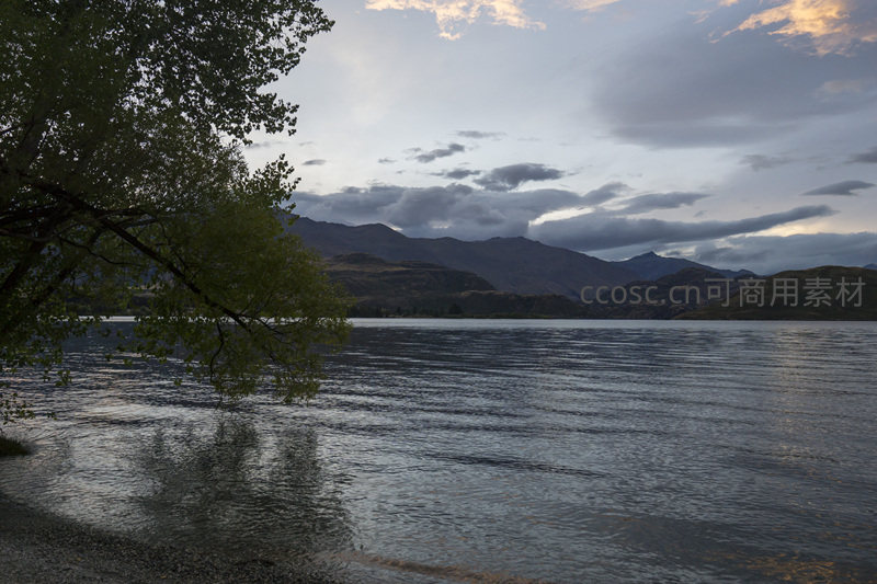 枝叶探湖面,山影沉暮霭之中