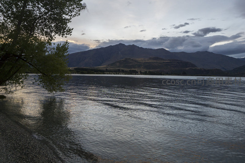湖畔大树枝叶婆娑,遮蔽部分水面,远处连绵山峦在暮色中显出苍茫之态,云层低垂,湖面波纹细腻,光影交错,展现自然的静美与辽阔。