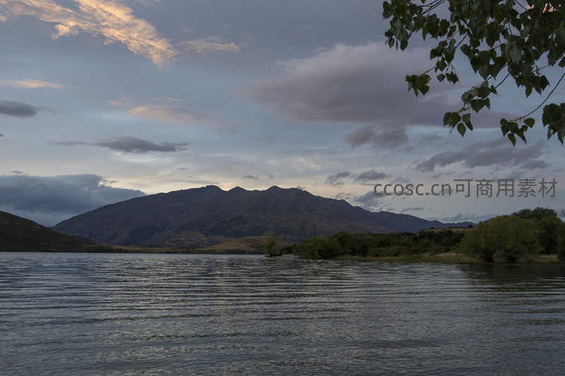 天边晚霞渐褪,湖水轻柔荡漾,群山静卧于远方,其轮廓与云影共同倒映水中,构成一幅和谐的自然风景画,令人心旷神怡。