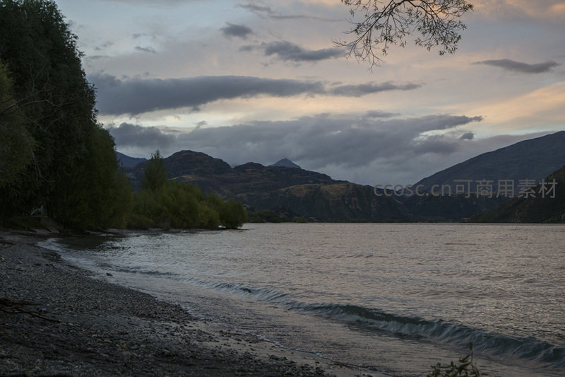 茂密树林沿湖岸延伸,微风拂过枝叶沙沙作响,湖水温柔拍打布满卵石的滩涂,远处山峦在薄暮中若隐若现,营造出远离尘嚣的幽静氛围。