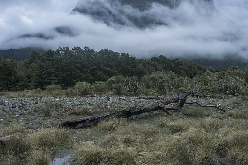 一根巨大的枯木横卧在湿地上,背景是浓密的森林与被云雾半掩的山体,整个画面充满原始野性,诉说着自然的沧桑与静默。