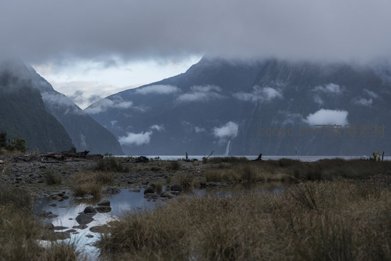 云海翻腾于群山之腰,山脚湿地中水洼星罗棋布,枯黄的草丛随风轻摆,倒映着天空与山峦,带来一种远离尘嚣的幽静与空灵。