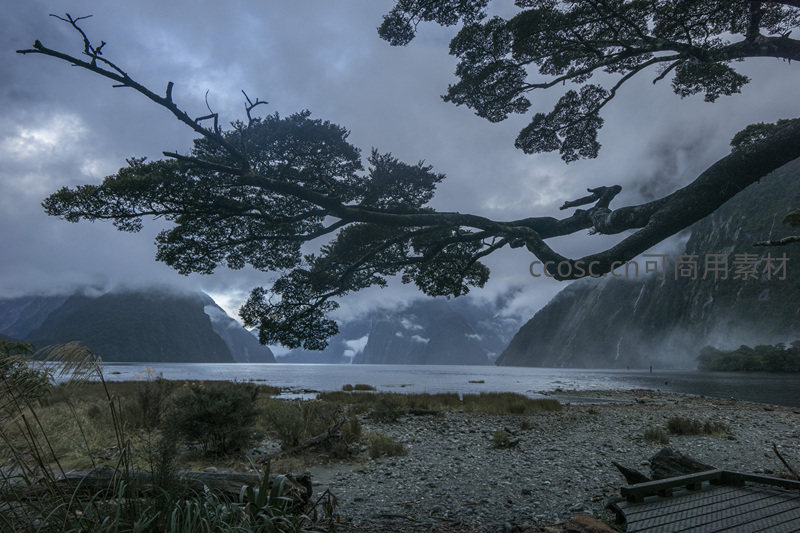 一棵苍劲古树横跨画面,浓密树冠在阴沉天空下更显雄伟。远处山峦隐于云海,湖水宁静,近处碎石滩与木栈道增添一丝人迹,构成壮丽的自然画卷。