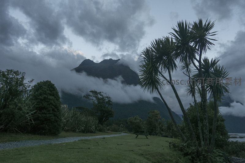 在暮色中,巍峨的山峰被厚重的云雾环绕,前景是挺拔的棕榈树和茂密的灌木丛,营造出一种静谧而神秘的自然氛围。