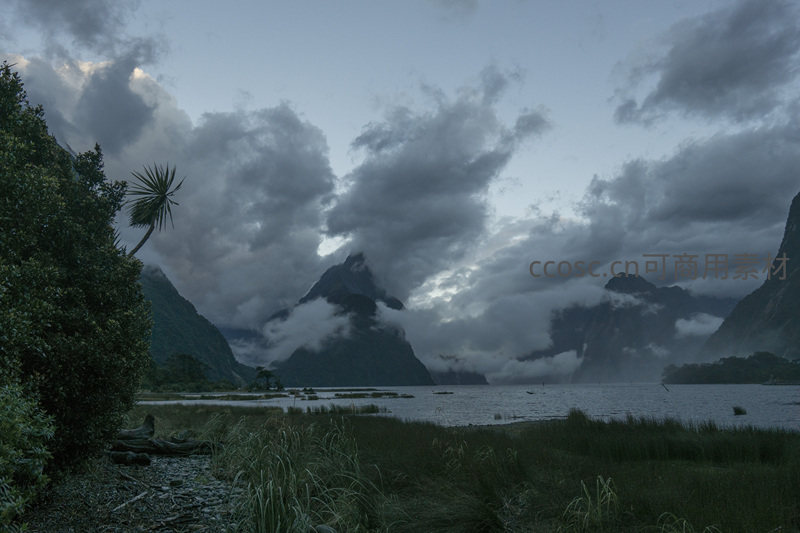 壮丽的峡湾山峰在翻滚的云海中若隐若现,前景是湿漉漉的草地和水生植物,展现出大自然鬼斧神工的雄伟与柔美。