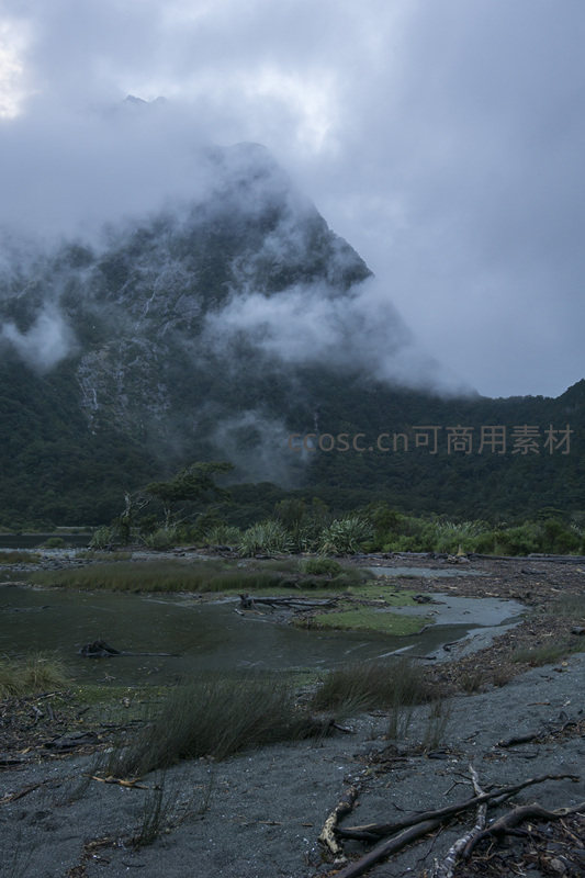 巨大的山体隐没在翻滚的云海之中,仅露出部分轮廓。前景是泥泞的湿地和稀疏植被,整个画面弥漫着一种静谧而略带苍凉的自然气息。
