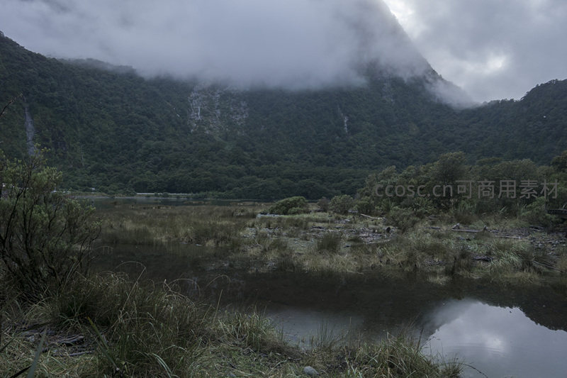 云雾山谷中的倒影湖泊