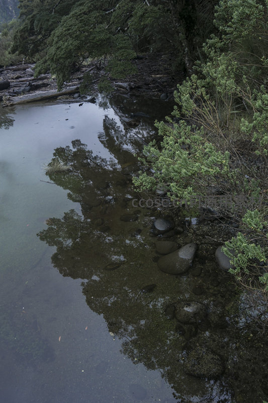 清澈溪水倒映绿树石滩幽静