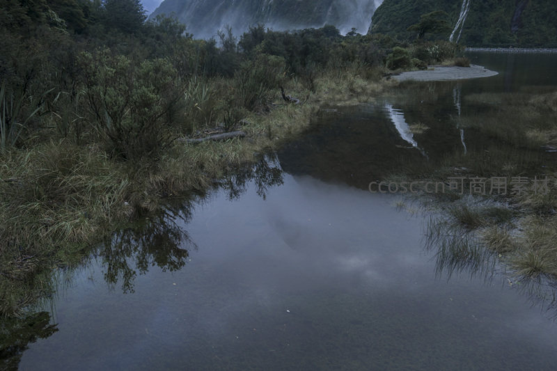 清澈的湖水如镜,完美倒映出远处雄伟的瀑布和葱郁的山林,营造出一种宁静而神秘的氛围,令人流连忘返。