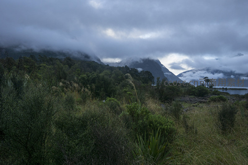 翻腾的云海轻柔地漫过山巅,前景是茂密的草丛与灌木,远处山体隐约可见,整个场景洋溢着野性与自然的生命力。