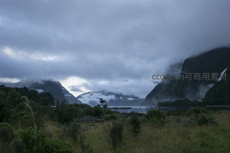 厚重的云层低垂,笼罩着巍峨的群山与静谧的湖水,近处绿植葱茏,远山若隐若现,营造出一种神秘而宁静的氛围。