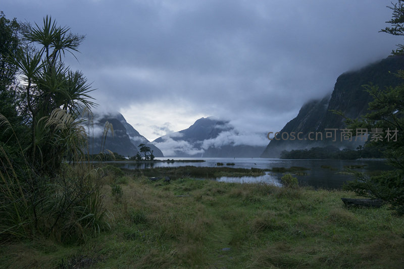 一条蜿蜒的小径穿过湿润的草地,引向被云雾环绕的远山,两侧植被茂盛,空气清新,仿佛通往一个远离尘嚣的世外桃源。