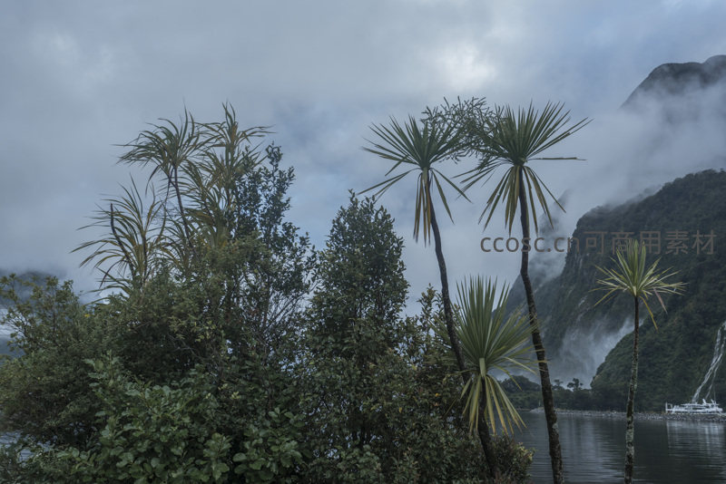 薄雾笼罩着幽静的湖面,几株高大的棕榈树在岸边挺立,远处青山若隐若现,营造出一种神秘而宁静的氛围。