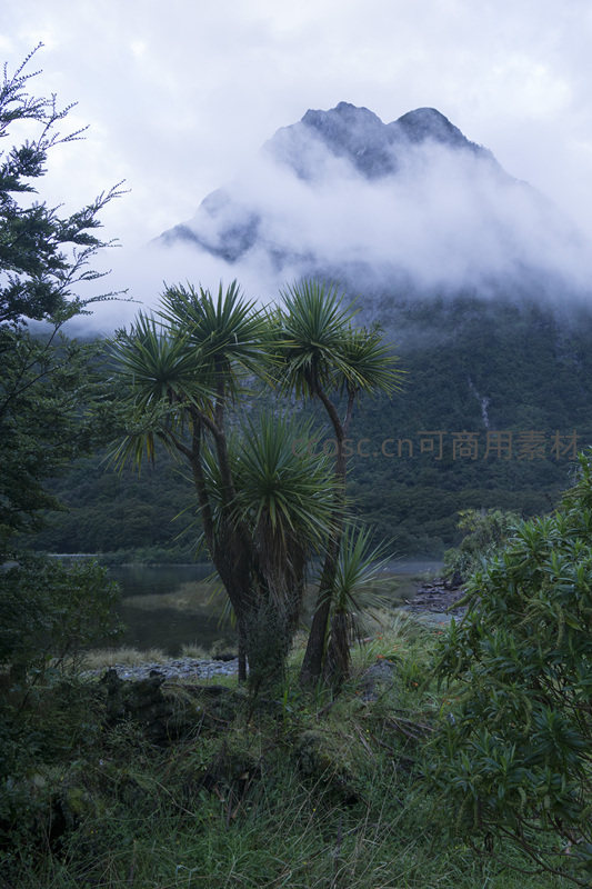 湖边几棵热带棕榈树静静伫立,背后是云雾缭绕的巍峨山峰,构成一幅如诗如画的自然景观画卷。