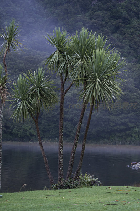 湖畔棕榈树与青山雾霭相映成趣