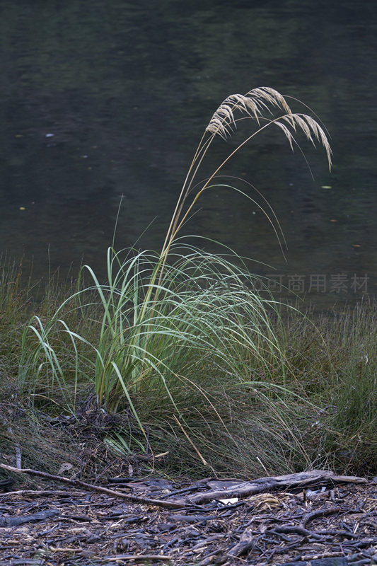 一丛柔美的芦苇在静谧水边随风摇曳,细长的茎叶与水面倒影交织,构成一幅充满诗意的湿地生态图景。