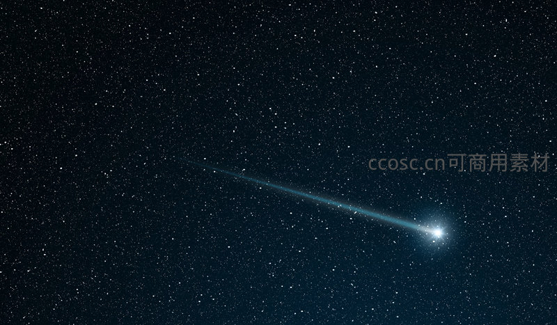 一颗明亮流星拖着长长的蓝色光尾,优雅地划过布满繁星的深邃夜空,留下转瞬即逝却令人难忘的美丽轨迹。