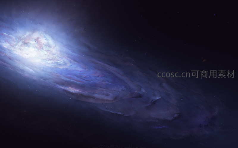 壮丽的旋涡星系横跨画面,中心明亮如灯塔,外围螺旋臂由蓝紫光晕交织而成,仿佛宇宙深处绽放的梦幻极光。