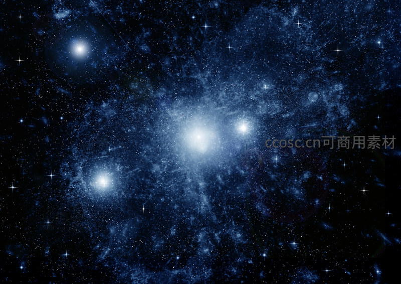 深邃的宇宙背景中,数个明亮的星团散发着耀眼光芒,周围弥漫着蓝色星云和细小星点,构成辉煌而神秘的天体图景。
