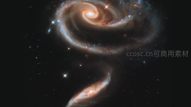 两个螺旋星系在黑暗宇宙中优雅旋转,旋臂结构清晰可见,仿佛宇宙之舞,展现天体间奇妙引力互动。
