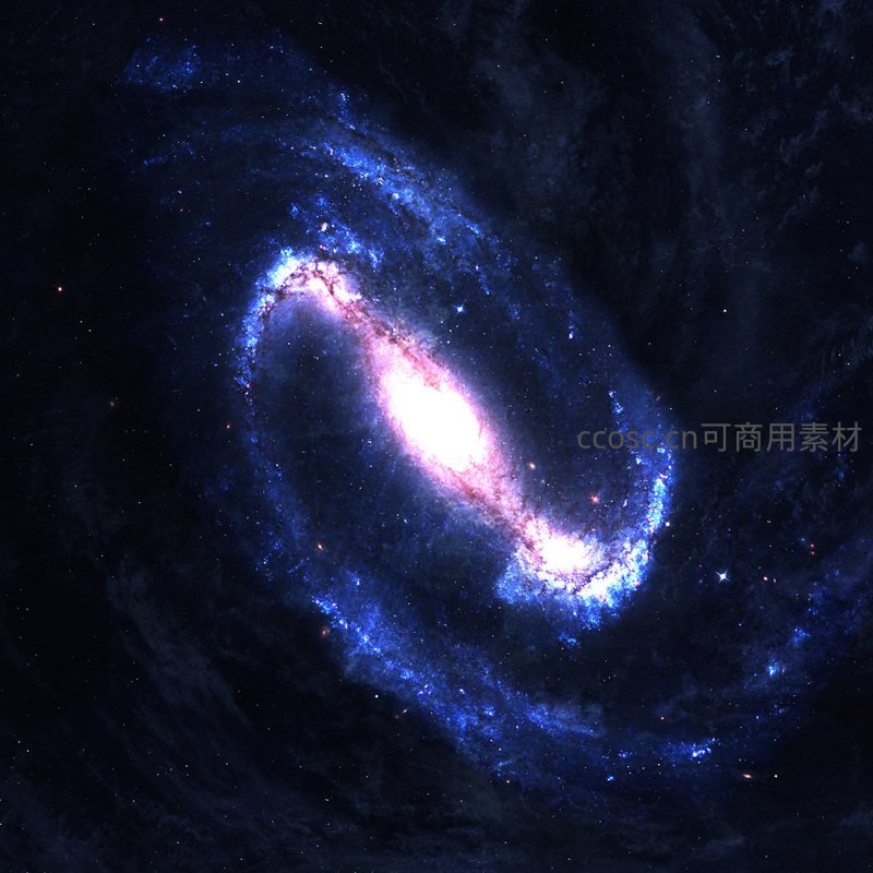 蓝粉相间的螺旋星系在黑暗宇宙中优雅旋转,中心亮区散发温暖光芒,星点如尘埃般飘洒,呈现宇宙中罕见的柔美与和谐。