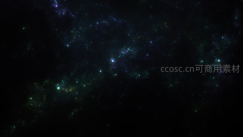 黑暗宇宙中,星云以蓝绿为主色调缓缓流动,星星如钻石般散落,构成一幅静谧而充满想象力的星际画卷。
