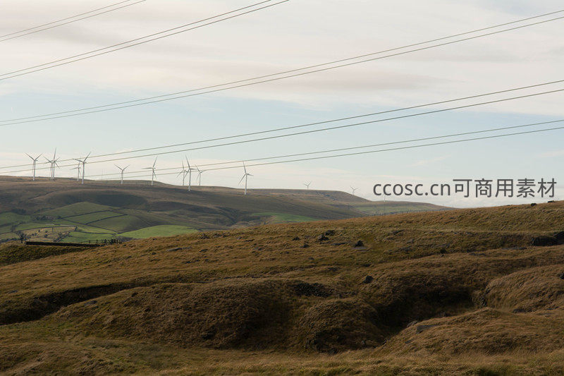 山坡之上风车阵列与电线交错