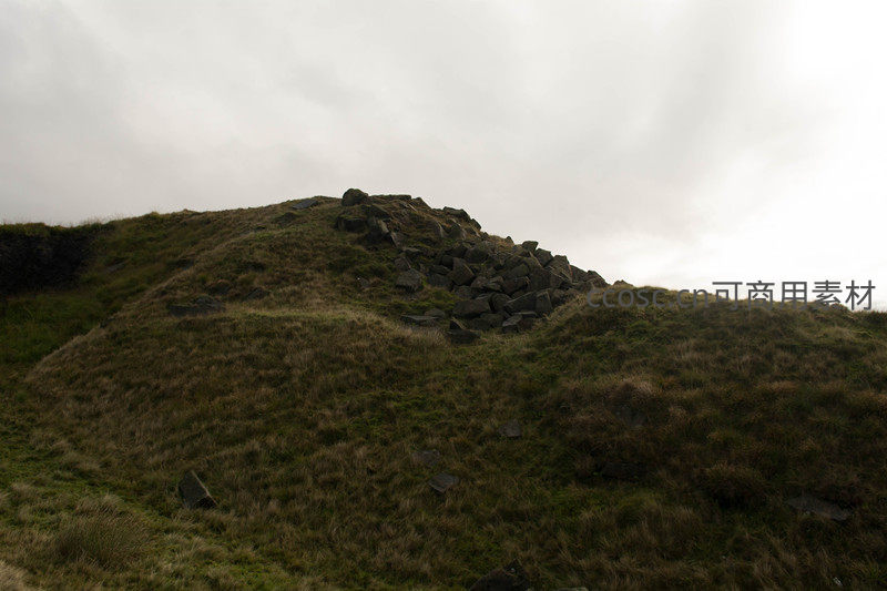 在广阔而略显荒芜的草坡上,一堆堆巨大的黑色岩石随意散落,与周围枯黄与翠绿交织的草地形成强烈对比,充满原始野性。