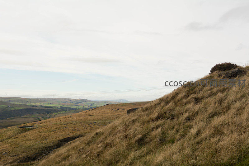 从高处山坡俯瞰,层层叠叠的绿色田野铺展至天际,远处可见风力发电机矗立。金黄的枯草与青翠的农田形成鲜明对比,构成一幅宁静的乡村画卷。