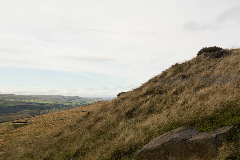 前景是覆盖着干枯黄草的陡峭山坡,一块深色岩石静卧其上。远景是连绵起伏的山峦和广阔的天空,整个画面充满了粗犷而原始的自然气息。